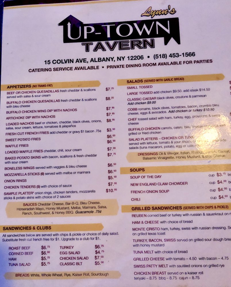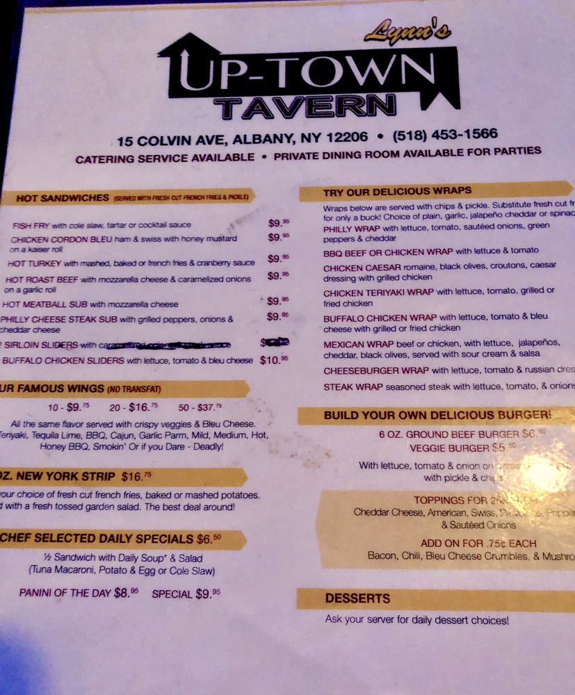 Welcome to Lynn's Uptown Tavern, a lively American sports bar nestled in Albany, NY. This unclaimed gem offers a friendly, neighborly atmosphere that invites you to unwind over delicious food and drinks. The menu is a celebration of classic fare, featuring mouthwatering appetizers like mozzarella sticks, jalapeno poppers, and the revered boneless wings—rumored to be the best in Albany!